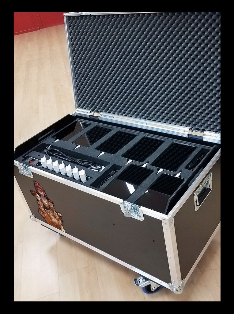 - L'ensemble est conditionné dans une malle sur mesure 95 x 55 x 65 cm, sur roulettes, avec plateau mousse pour le matériel informatique et rampe de recharge électrique intégrée (permet de recharger les batteries tablettes). (pour la version flightcase)